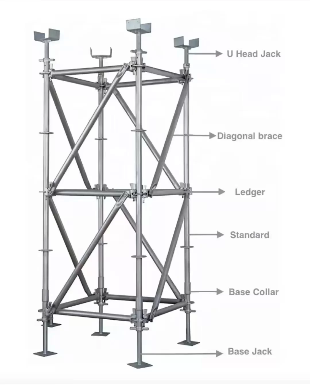 Sistem ini berfungsi dengan menggabungkan piawaian menegak dengan lejar mendatar dan pendakap pepenjuru melalui sambungan roset. Platform dipasang pada lejar untuk menyediakan permukaan kerja yang selamat untuk kakitangan dan bahan. Pengawal dan papan kaki meningkatkan keselamatan, manakala bicu asas memastikan pemasangan yang stabil pada permukaan yang tidak rata.